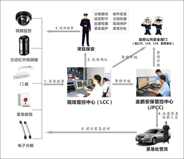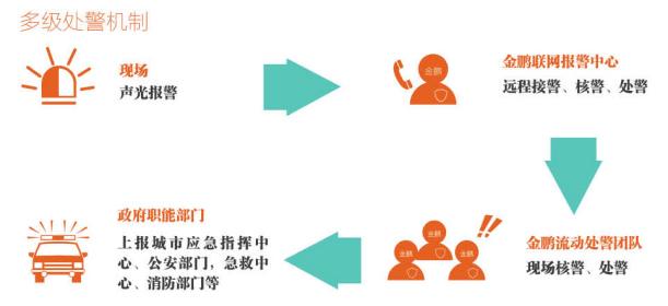 金鵬聯網報警安全服務解決方案是區別于傳統聯網報警的新一代“智能+”報警與安全防范綜合運營服務產品。金鵬依托自有的“人防+物防+技防”深度結合的運營服務體系,建立多級聯動處警機制,為聯網報警用戶提供快速、有效的警情處置服務,并通過安保應急服務網點,確保緊急處警人員第一時間趕赴現場進行警情處置。