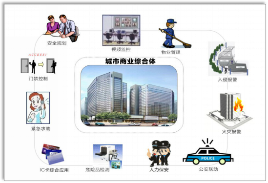 面向集成了商業、辦公、居住、餐飲、酒店、文娛等多功能的城市綜合經濟體,提供從安全系統的咨詢、設計、培訓、優化、評估、安防產品供應、工程實施、系統搭建到人員派駐、接報、受理、出警、巡查、系統維護以及各類技防系統租賃、業務租賃等一條龍的安全保衛服務。