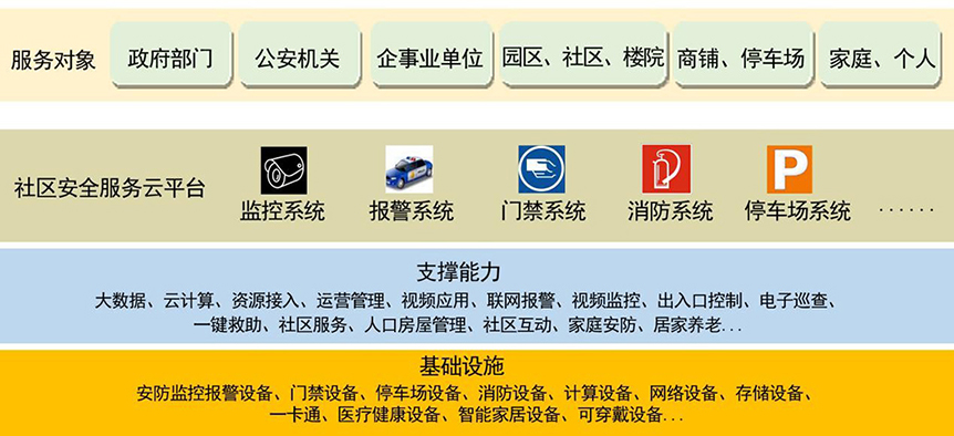 平臺依托計算機自動化控制技術、通信技術、圖形顯示技術等核心高科技術,全面整合人防、技防、物防,全面融合安防子系統,將報警現場、聯網報警中心、企業先期建成的安防系統、物業保安、聯防保安、廣大市民、公安110、政府其他主管部門等政府安全防范資源和社會安全防范資源與報警事件相關的元素整理融合,形成一個協同完整的立體化防控體系,實現互聯互通,實現從市、區、街到企業、園區、社區的多級社會安全的聯網運營管理,全面滿足政府、公安、行業、企業、家庭個人各層級、各方面的安全需求,提升對突發警情的反應能力與處警速度,確保社區安全無憂,最終形成智慧城市社會安全體系的重要組成。